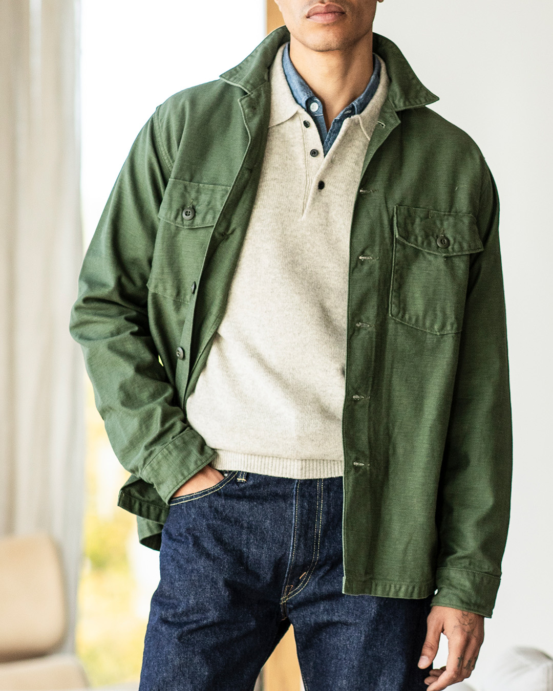 Just den här overshirten från Orslow är tänkt att ha instoppad, då det är en reproduktion av ett original från 60-talet. Men den fungerar lika väl utanpå som en vanlig overshirt. Detta är ett mångsidigt plagg som går att både dressa upp och dressa ner, men jag tycker den blir absolut snyggast när man mixar exempelvis med ett par pennyloafers i mocka och ett par jeans, kanske något stickat under för att skapa en liten ”krock”.